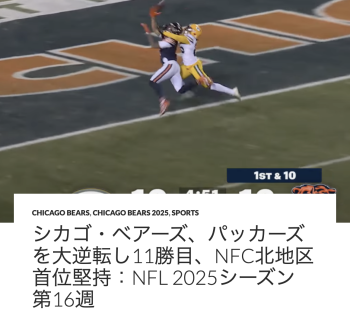 << 2025年12月8日投稿:画像は記事にリンク >> シカゴ・ベアーズ、パッカーズとの競り合いを落としNFC第1シード陥落:NFL 2025シーズン 第14週