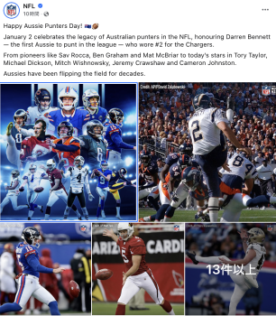 ” January 2 celebrates the legacy of Australian punters in the NFL, honouring Darren Bennett — the first Aussie to punt in the league — who wore #2 for the Chargers.