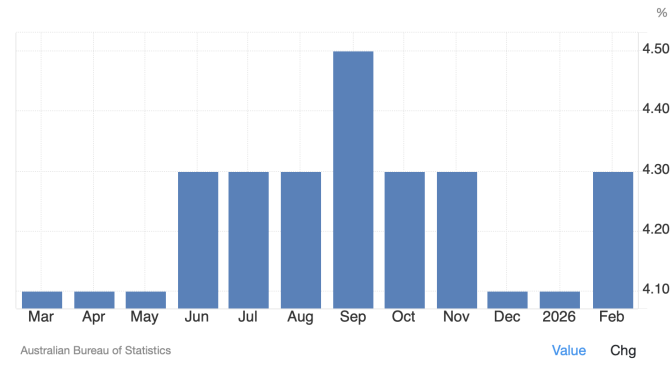 市場は現在、5月の0.25%追加利上げを約57%の確率で織り込んでいる。 オックスフォード・エコノミクス・オーストラリアのエコノミスト、ハリー・マコーリー氏は「2月の統計は労働市場減速の初期の兆候が見られた」と述べた。