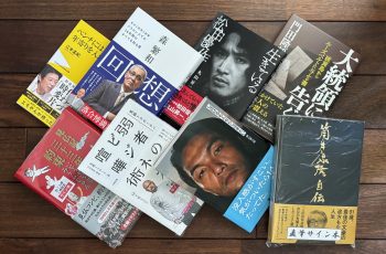 l to r:(上段)江本孟紀『ベンチには年寄りを入れなさい』, 森繁和『回想 ドラゴンズでの14年間のすべてを知る男』, 丸山昇一『生きている松田優作』, 門田隆将『大統領に告ぐ 硫黄島からルーズベルトに与ふる書』(下段)いとうせいこう みうらじゅん『見仏記 三十三年後の約束』, 鬼越トマホーク『鬼越トマホークの弱者のビジネス喧嘩術』, 盛山晋太郎『しばけるもんならしばきたい』, 筒井康隆『筒井康隆自伝』