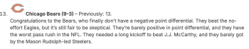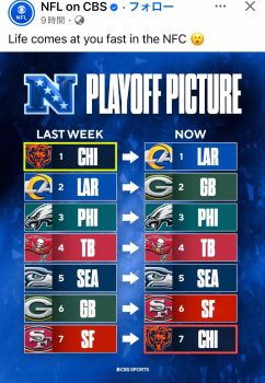 Chicago Bears:シカゴ・ベアーズがNFC第1シード浮上の話題がSNSで散見。「Power Rankings は、どうなるんだろう?」と注目していましたが、評価はそれぞれといった印象ながら、